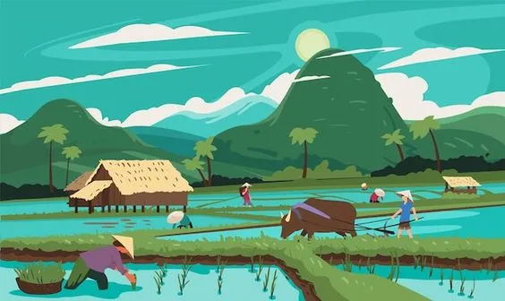 Tampak pada gambar diatas tampilan pemandangan para petani sedang mengurusi lahan persawahan mereka dengan disekeliling mereka terdapat area perbukitan hijau. Keberadaan para petani yang bekerja di persawahan menunjukkan kerja keras dan keterampilan yang diperlukan untuk mengelola tanah dan bercocok tanam. Pemandangan ini mengingatkan kita tentang betapa pentingnya upaya untuk menjaga kelestarian alam dan keberlanjutan ekonomi yang berkelanjutan.