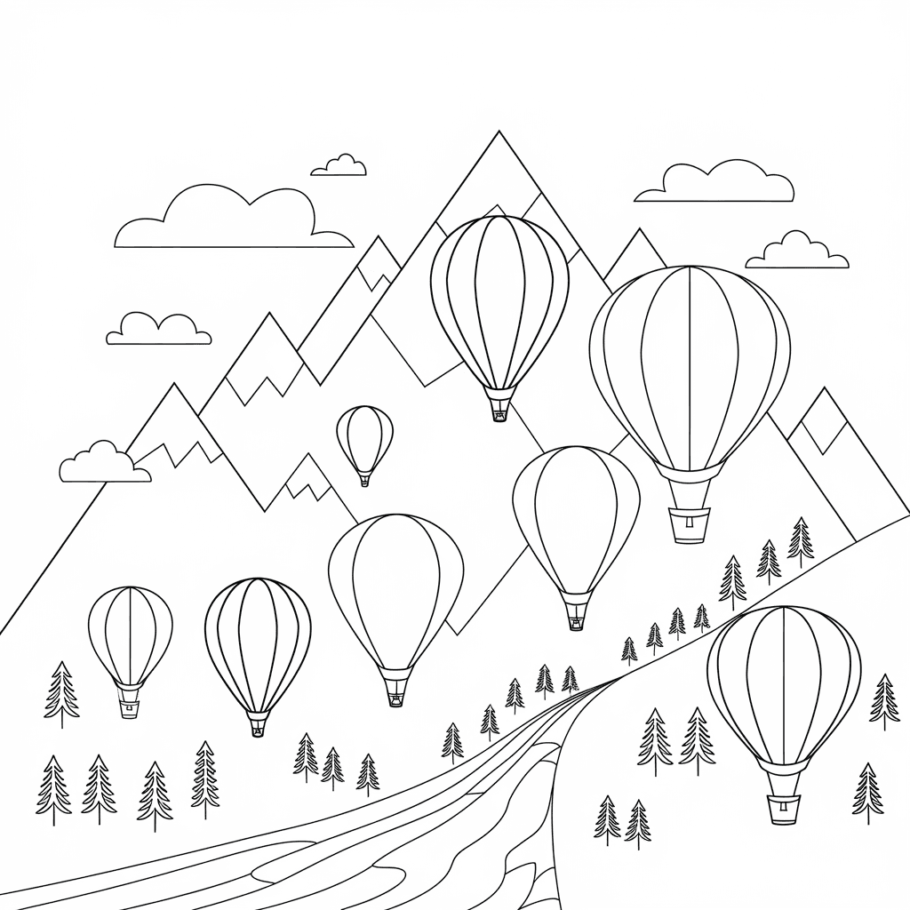 Balon udara berwarna-warni yang terbang di atas pegunungan, menambah kesan magis pada pemandangan.