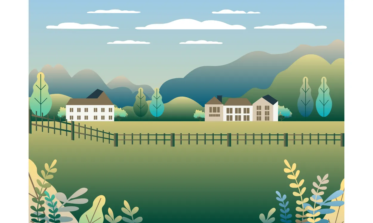 Tampak pada gambar diatas tampilan pemandangan rumah pedesaan bertingkat dengan dikelilingi pagar, pepohonan serta perbukitan hijau. Pemandangan rumah pedesaan yang dikelilingi oleh pepohonan dan perbukitan hijau dapat memberikan kesan alami yang menyejukkan dan menenangkan. Pemandangan ini bisa memberikan kesan bahwa manusia hidup beriringan dengan alam.