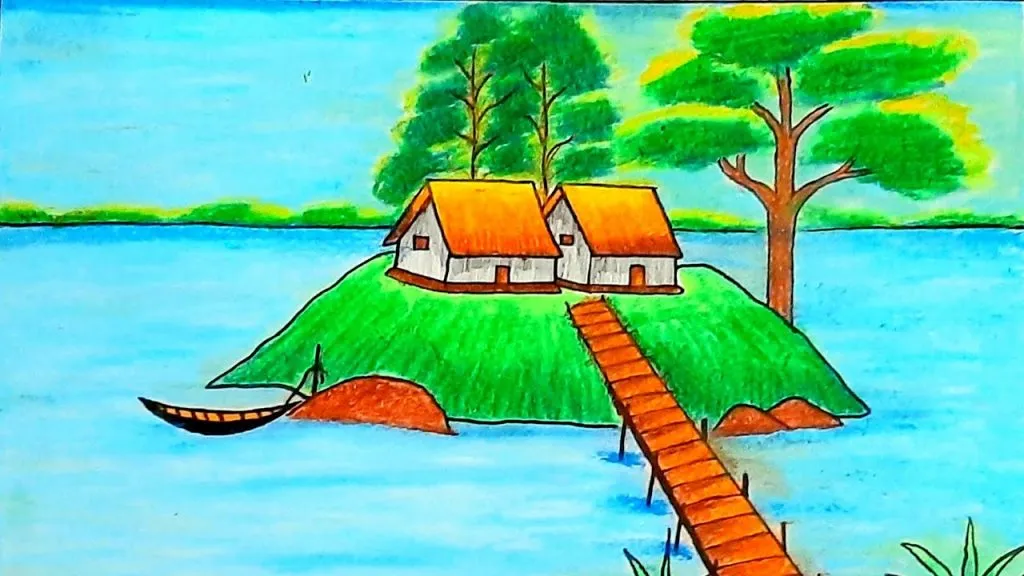 Tampak pada gambar diatas tampilan pemandangan rumah simpel pedesaan dengan didekatnya terdapat hamparan sungai dan pepohonan.