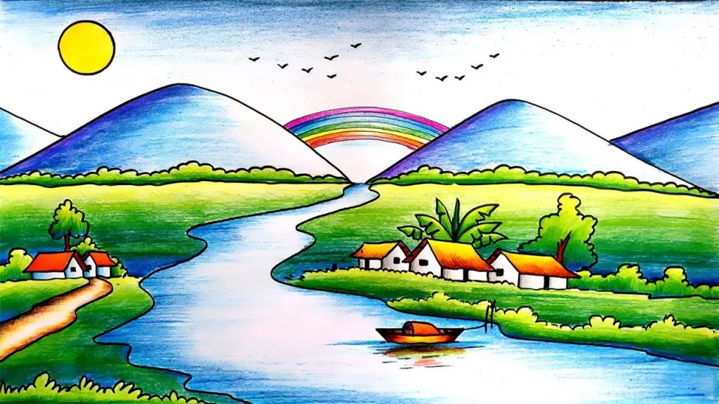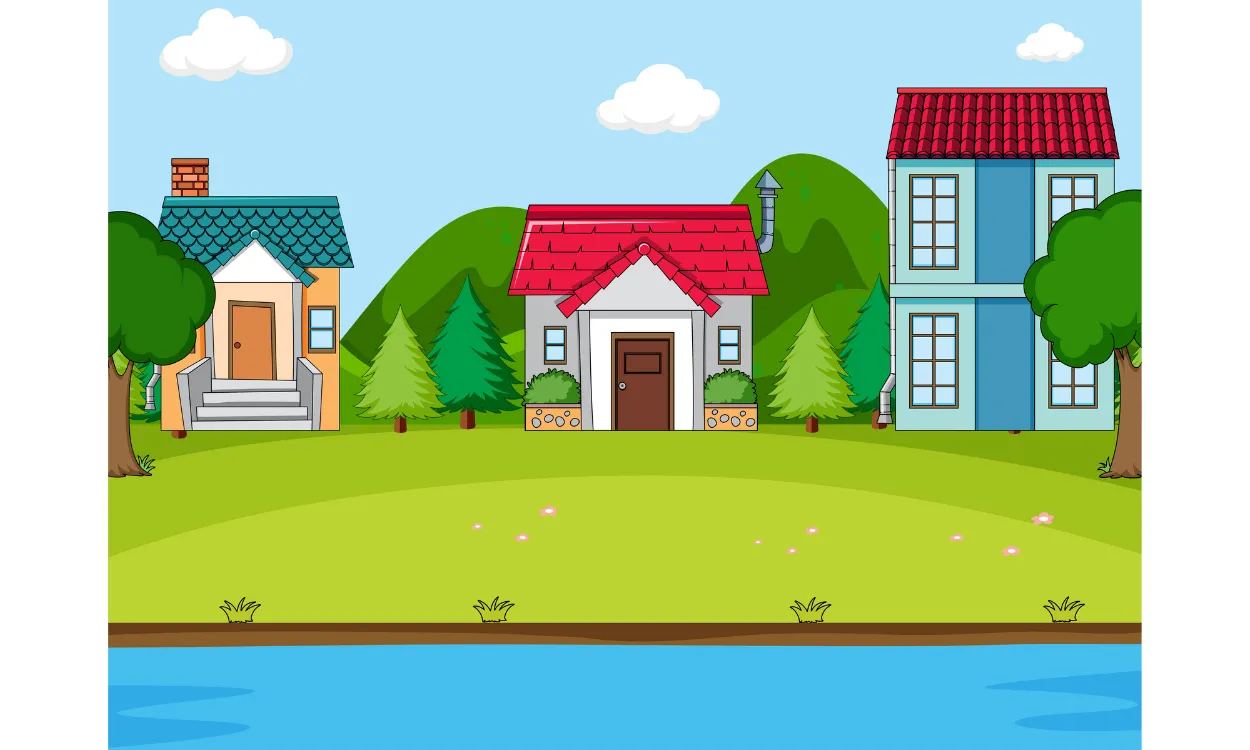 Berikut kalian akan dapat melihat tampilan gambar pemandangan beberapa rumha sederhana namun indah dengan disekelilingnya terdapat banyak pepohonan, hamparan sungai dan juga perbukitan. Pemandangan yang ditunjukkan oleh gambar tersebut memberikan kesan alami dan tenang dengan suasana pedesaan yang asri. Kehadiran banyak pepohonan, hamparan sungai, dan perbukitan memberikan kesan harmonis dengan alam sekitar yang asli. Meskipun rumah-rumah yang terlihat sederhana, tetapi keindahan dan kedamaian pemandangan yang disuguhkan cukup menggugah hati dan pikiran.