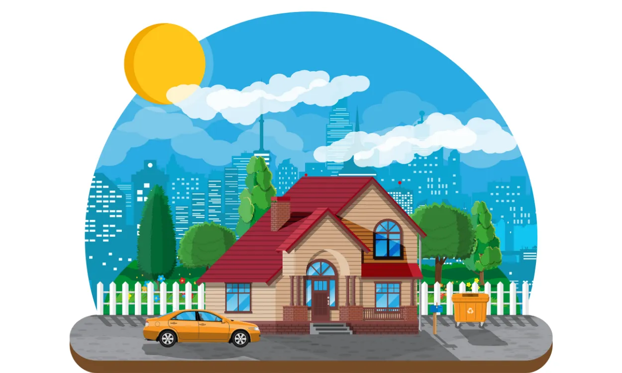 Gambar pemandangan kartun rumah modern dengan warna abu-abu memberikan kesan kesederhanaan dan kesegaran. Warna abu-abu yang digunakan pada rumah tersebut memberikan kesan modern dan elegan, sementara garasi dan carport yang terlihat memberikan kesan praktis dan fungsional. Selain itu, tampilan rumah yang simpel juga memberikan kesan minimalis dan efisien.