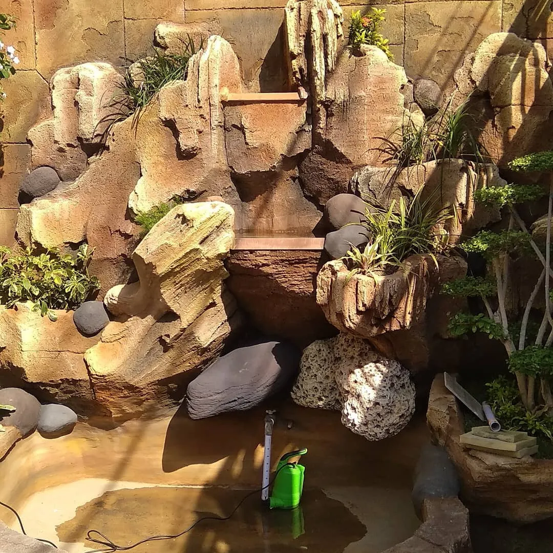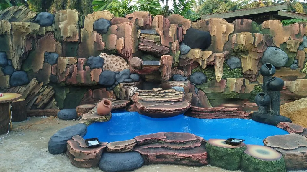 Begitu indahnya tampilan taman tebing air terjun yg terdapat diatas yg menghadirkan batu alam yg tersusun rapi membentuk dinding tebing dan juga kolam didepannya. Jelas tampilan taman tebing air terjun diatas dapat membuat diri kita senang dan bahagia.