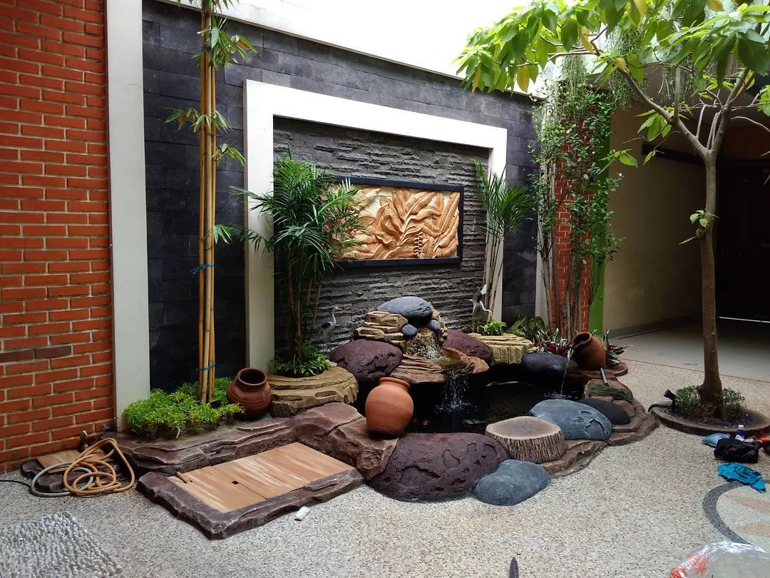 Simpel namun tetap terlihat indah, begitulah sekiranya tampilan teman tebing air terjun mini yg terdapat diatas. Seperti yg kalian lihat taman diatas hadir dengan dinding dan bongkahan batuan tempat air mengalir, kolam, dan untuk sentuhan akhirnya berupa tanaman bonsai yg tersebar di pinggiran kolam sob. Buatlah yg beginian di halaman belakang rumah kalian ya sob. Sehingga kalian pun dapat melihat pemandangan yg indah setelahnya.