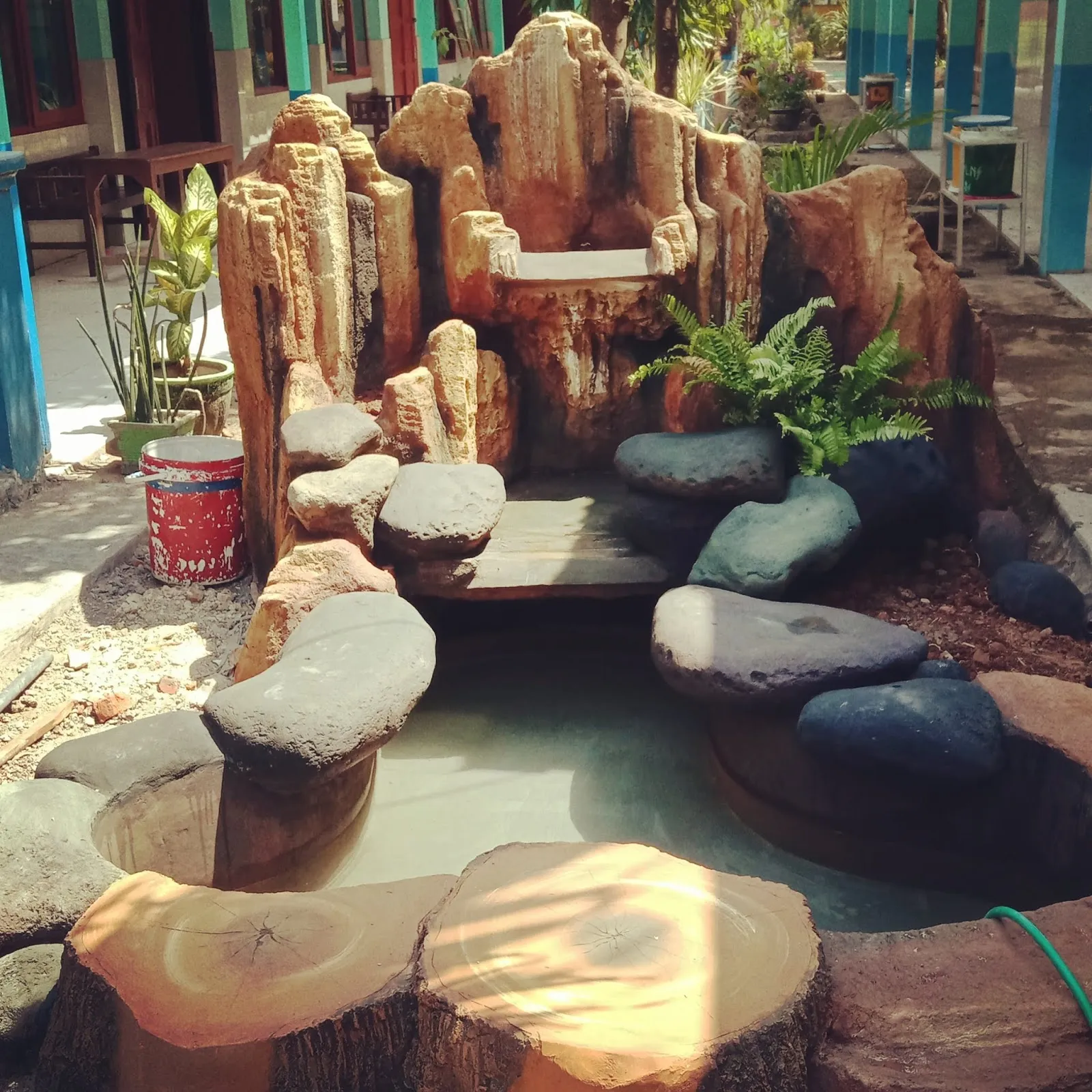 Bongkahan bat alam bewarna cokelat yg tersusun rapi membentuk dinding tebing dan kolam dibawahnya, menjadikan tampilan taman tebing air terjun diatas terlihat keren dan epic banget sob. Para tamu dan tetangga kalian akan terkagum dengan taman pada hunian kalian sob.