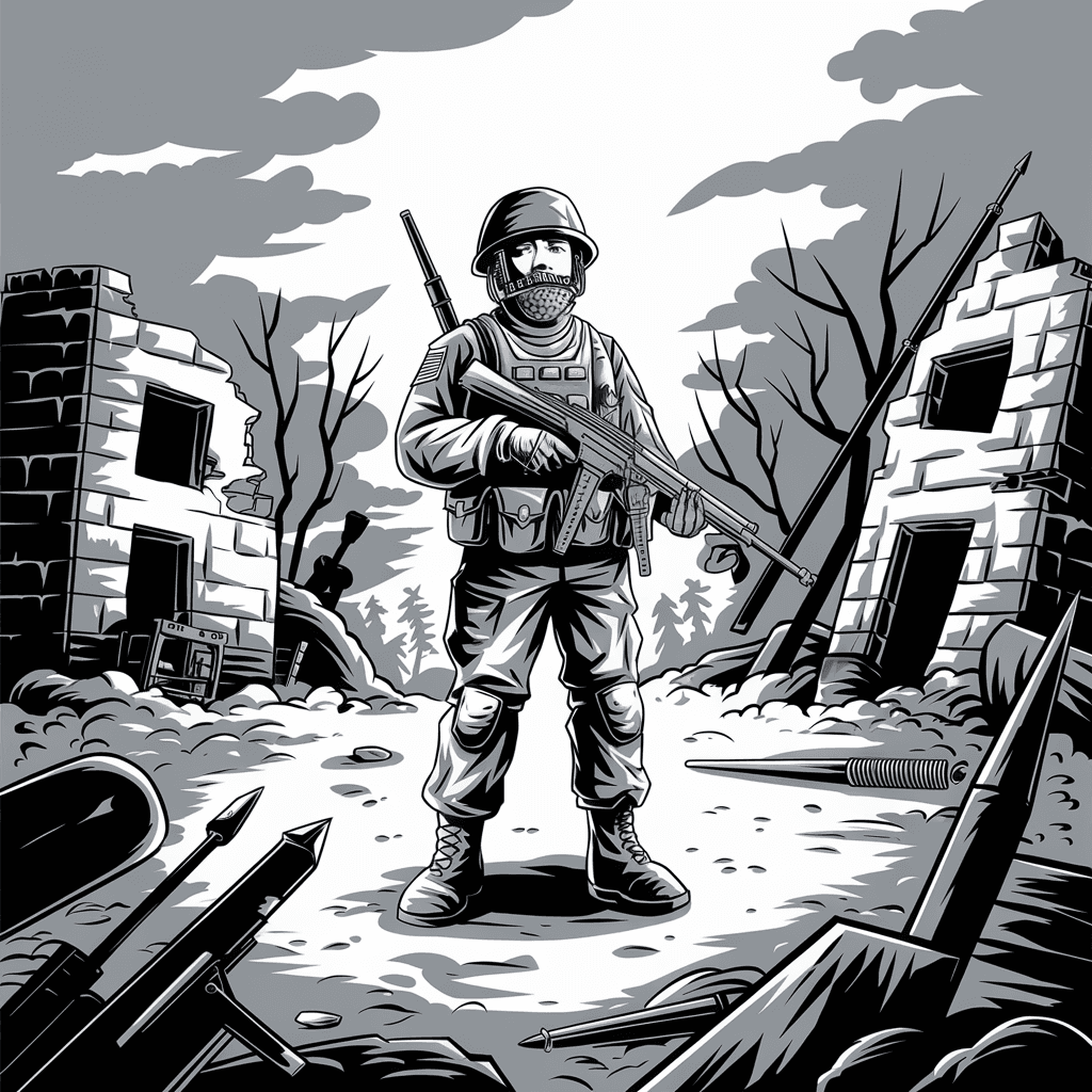 Ilustrasi prajurit TNI di medan tempur, berjongkok di balik barikade dengan latar belakang medan perang yang realistis namun bergaya kartun.