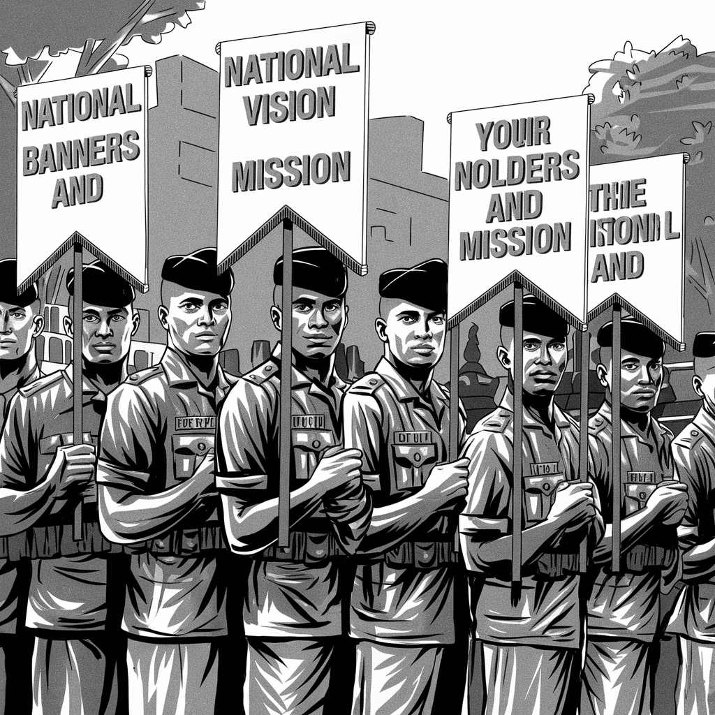 Gambar prajurit TNI yang sedang memegang spanduk atau plakat yang menampilkan visi misi nasional, simbol dedikasi mereka terhadap negara.