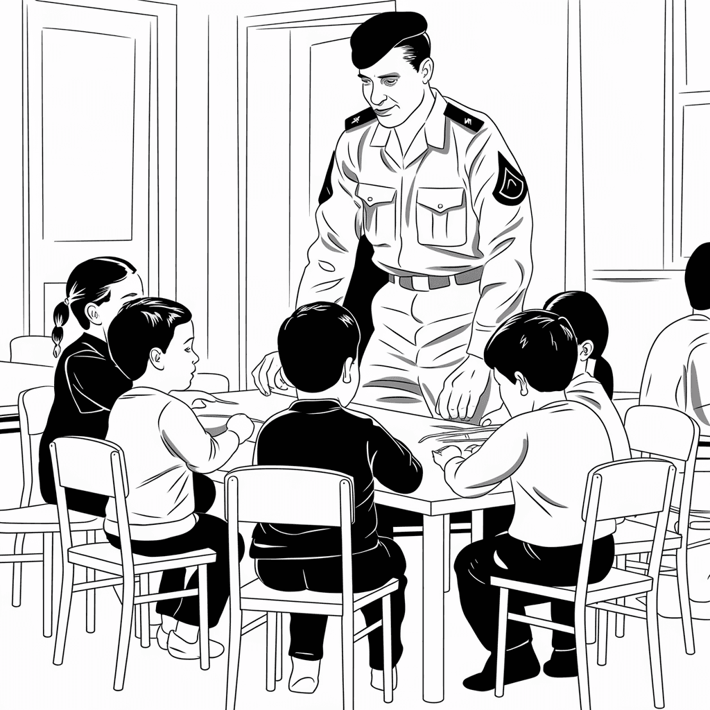 Ilustrasi prajurit TNI yang sedang mengajar anak-anak atau memberikan bantuan sosial di komunitas, menampilkan sisi kemanusiaan mereka.