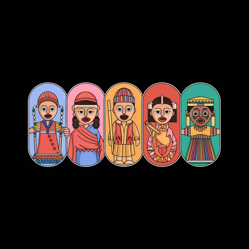 Desain simbol-simbol kebudayaan seperti wayang atau candi dalam warna hitam untuk kategori “Kebudayaan” atau “Warisan”.