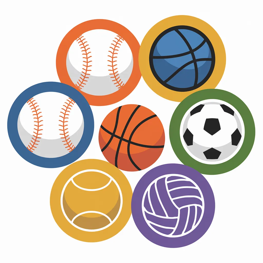 Ilustrasikan ikon-ikon olahraga seperti bola, sepatu lari, atau bola basket dalam warna hitam untuk kategori “Sports” at