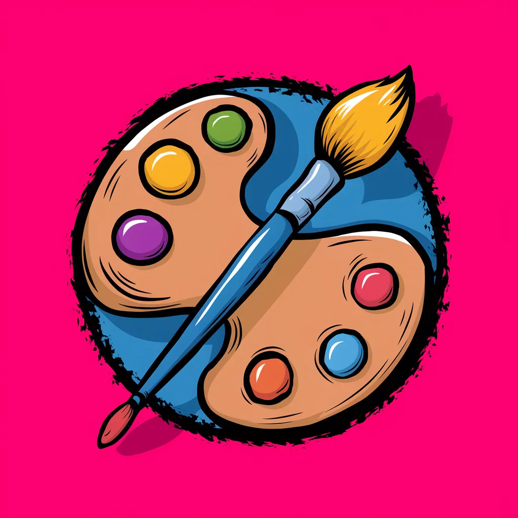 Ilustrasikan ikon-ikon seni seperti palet lukis, kuas, atau kamera dalam warna