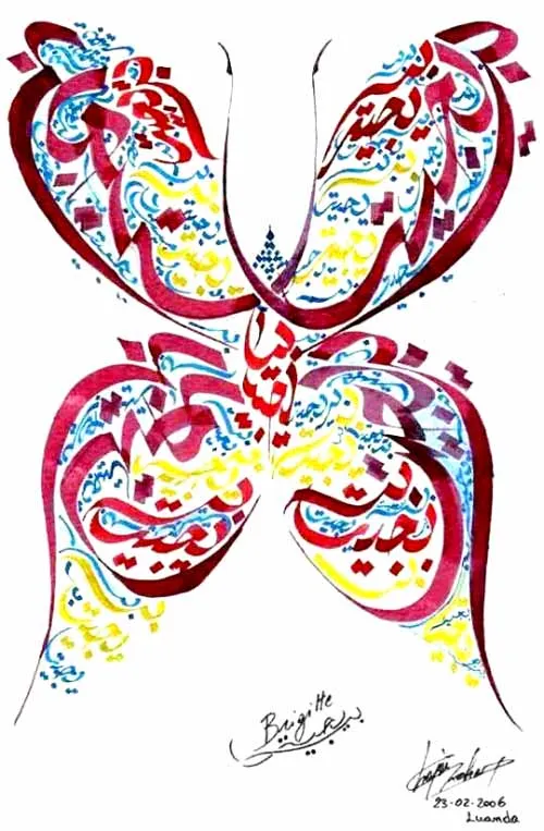 Super duper indah tampilan gambar kaligrafi berbentuk kupu-kupu beragam warna yg terdapat diatas ya sob. Masih berkaitan dengan kaligrafi bahwasanya, Memasang kaligrafi Nabi Muhammad SAW adalah bagian dari upaya tabarruk, atau mengambil berkah dari nama Rasulullah SAW. Menurut para ulama, hukum mengambil berkah melalui kaligrafi atau dijadikan nama seseorang adalah boleh.