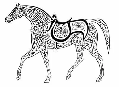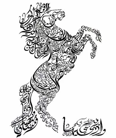 Adapun gambar kaligrafi berikut ini memiliki bentuk yg sama dengan yg ada pada gambar sebelumnya yakni berbentuk kuda. Membahas mengenai kaligrafi bahwa, keistimewaan lain kaligrafi dalam seni Islam ialah  sebagai bentuk pengejawantahan firman Allah dan karya seni yg sangat berkaitan dengan Alquran dan hadis. Karena, sebagian besar tulisan indah dalam bahasa Arab menampilkan ayat Alquran atau hadis Nabi Muhammad SAW.