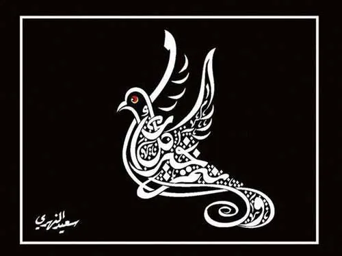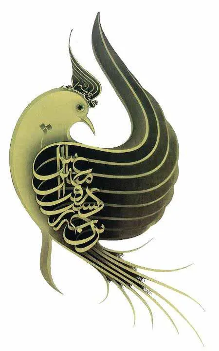 Terlihat pada gambar diatas berupa tampilan gambar kaligrafi bentuk burung merpati ya sob. Membahas mengenai kaligrafi  bahwa menulis ayat al Qur’an dengan format kaligrafi yg sulit dibaca adalah menyalahi kode etik. Sedang menuliskannya dengan bentuk burung atau yg lain adalah dilarang. Wallahu a’lam bis shawab.