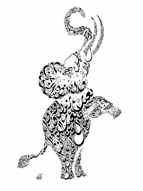 Berikut pada gambar diatas berupa tampilan gambar kaligrafi berbentuk hewan gajah yg sedang berusaha untuk dapat berdiri dengan dua kaki. Buat kalian yg belum memahami pengertian kaligrafi bahwa, Kaligrafi, dari bahasa Yunani; καλλι “keindahan” + γραφος “menulis”) atau seni khat ialah seni menulis dengan indah dengan pena sebagai hiasan. Tulisan dalam bentuk kaligrafi biasanya tidak untuk dibaca dengan konsentrasi tinggi dalam waktu lama, karena sifatnya yg membuat mata cepat lelah.