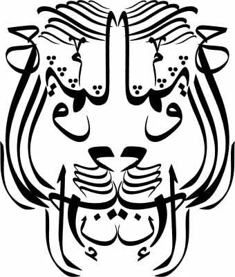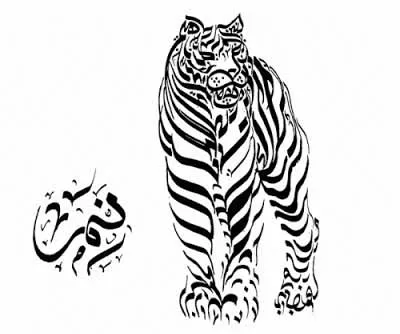 Berikut pada gambar diatas berupa kaligrafi berbentuk kepala macan. Berkaitan dengan kaligrafi bahwa, Kaligrafi Islam, yang dalam juga sering disebut sebagai kaligrafi Arab atau seni lukis huruf Arab, ialah suatu seni artistik tulisan tangan, atau kaligrafi, serta meliputi hal penjilidan, yg berkembang di negera-negera yg umumnya memiliki warisan budaya Islam.