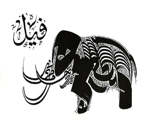 Meski hanya menghadirkan satu warna sahaja yakni hitam namun tampilan gambar kaligrafi berbentuk gajah yg terdapat diatasSungguh menarik dan indah banget. Selain itu perlu untuk kalian ketahui juga bahwa, Imam Abdurrahman al Jaziri di dalam kitabnya (al Fiqh ‘Ala Madzahib al Arba’ah) mengutip pernyataan ilmuan dari kalangan madzhab Syafi’i yg menyatakan bahwa boleh menggambar atau melukis selain hewan seperti pepohonan, perahu, matahari dan rembulan. Sedang menggambar hewan, baik yg berakal atau tidak adalah tidak diperbolehkan.