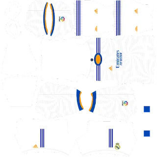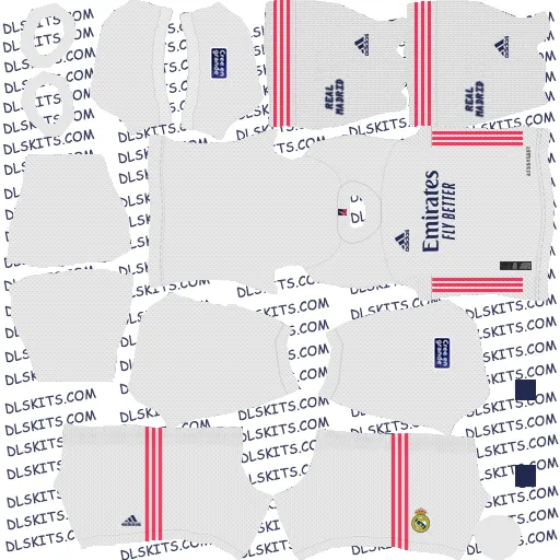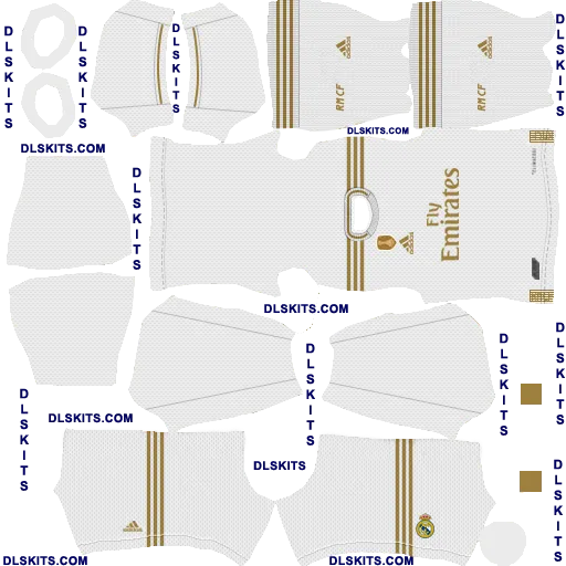 Kit DLS Real Madrid terdiri dari kaus kaki panjang, celana pendek, dan kaos kaki yang menampilkan warna putih sebagai warna dasar, dengan aksen hitam dan kadang-kadang emas atau perak.
