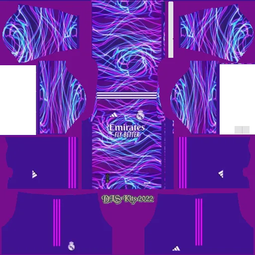 Tampak pada gambar diatas Kit FTS club sepak bola Real Madrid dengan tampilan biru dan ungu. Tampilan Kit FTS Real Madrid dengan motif gravity warna biru dan ungu memberikan kesan yang futuristik dan modern. Warna biru dan ungu yang dipadukan memberikan kesan yang berbeda dari tampilan tradisional klub Real Madrid yang sering kali menggunakan warna putih sebagai warna utama.