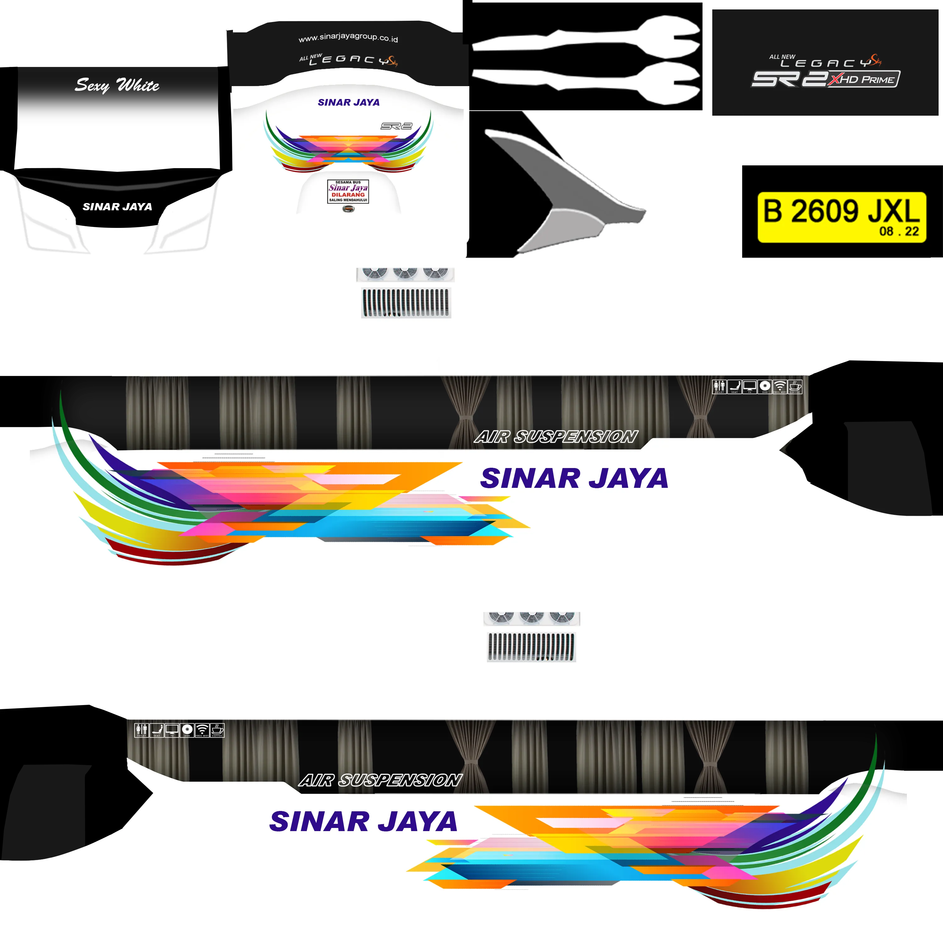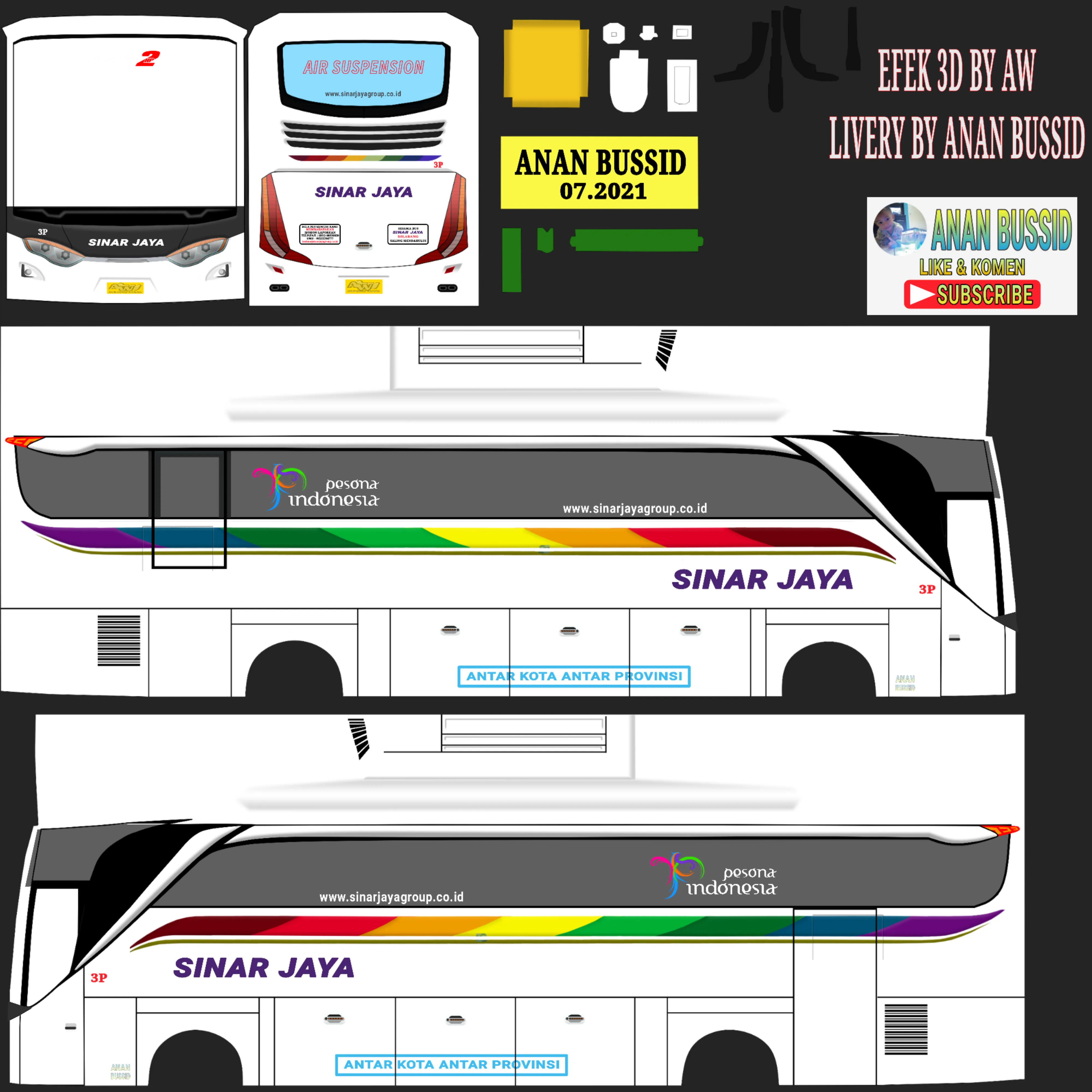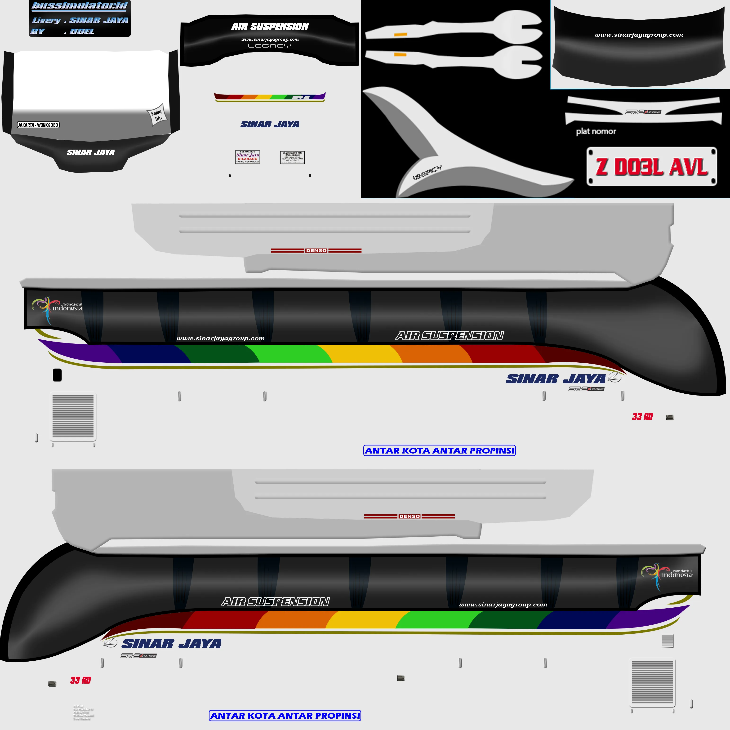 Desain yg terkesan simpel namun terlihat elegan yg dibalut dengan tulisan sinar jaya yg terkenal dengan bus yg sangat mewah, livery ini dibuat mengikuti dengan tampilan asli dari bus sinar jaya. Bila kalian belum menemukan livery yg cocok, mungkin ini dapat menjadi pilihan alternatif lain untuk dapat kalian pakai.