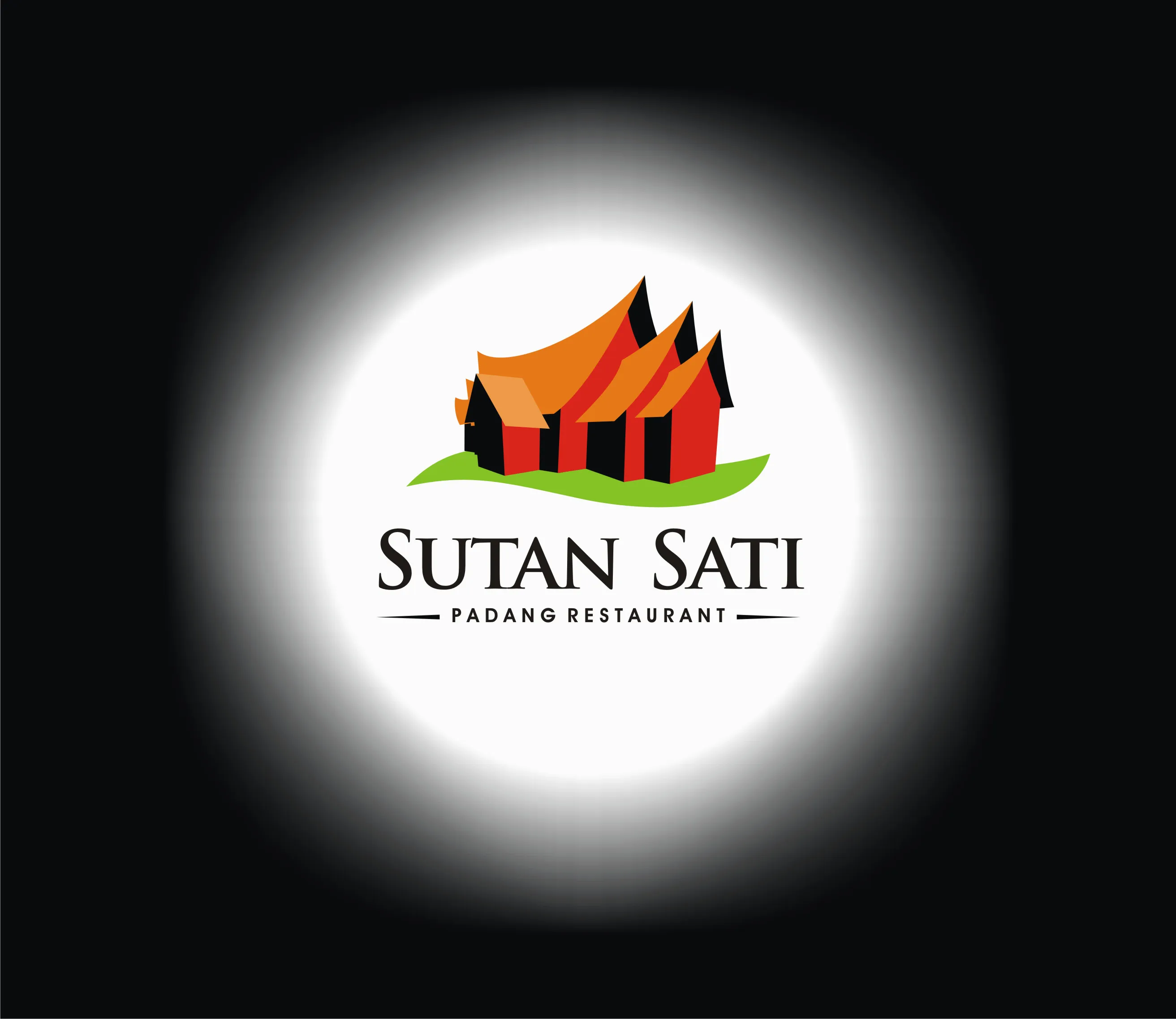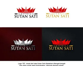 Berikut pada gambar diatas ialah logo rumah makan padang dengan tampilan objek gambar berupa icon rumah gadang bewarna hitam, merah dan cokelat lengkap dengan latar belakang warna putih seperti cahaya dan warna hitam.