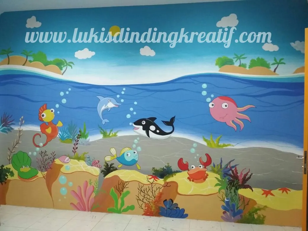 Berikutnya ini terdapat lukisan dinding sekolah dengan menghadirkan situasi dunia bawah laut sebagai motifnya,hadirnya beragam hewan-hewan laut,,suasana bawah laut ,serta objek-objek lainnya seperti terumbung karang,dan tanaman-tanaman laut menjadikan lukisan dinding satu ini terlihat sanbat hidup dan dapat menghadirkan suasana tenang pada sebuah ruangan belajar,akan banyak anak-anak yg suka sekali dengan lukisan dinding seperti ini.