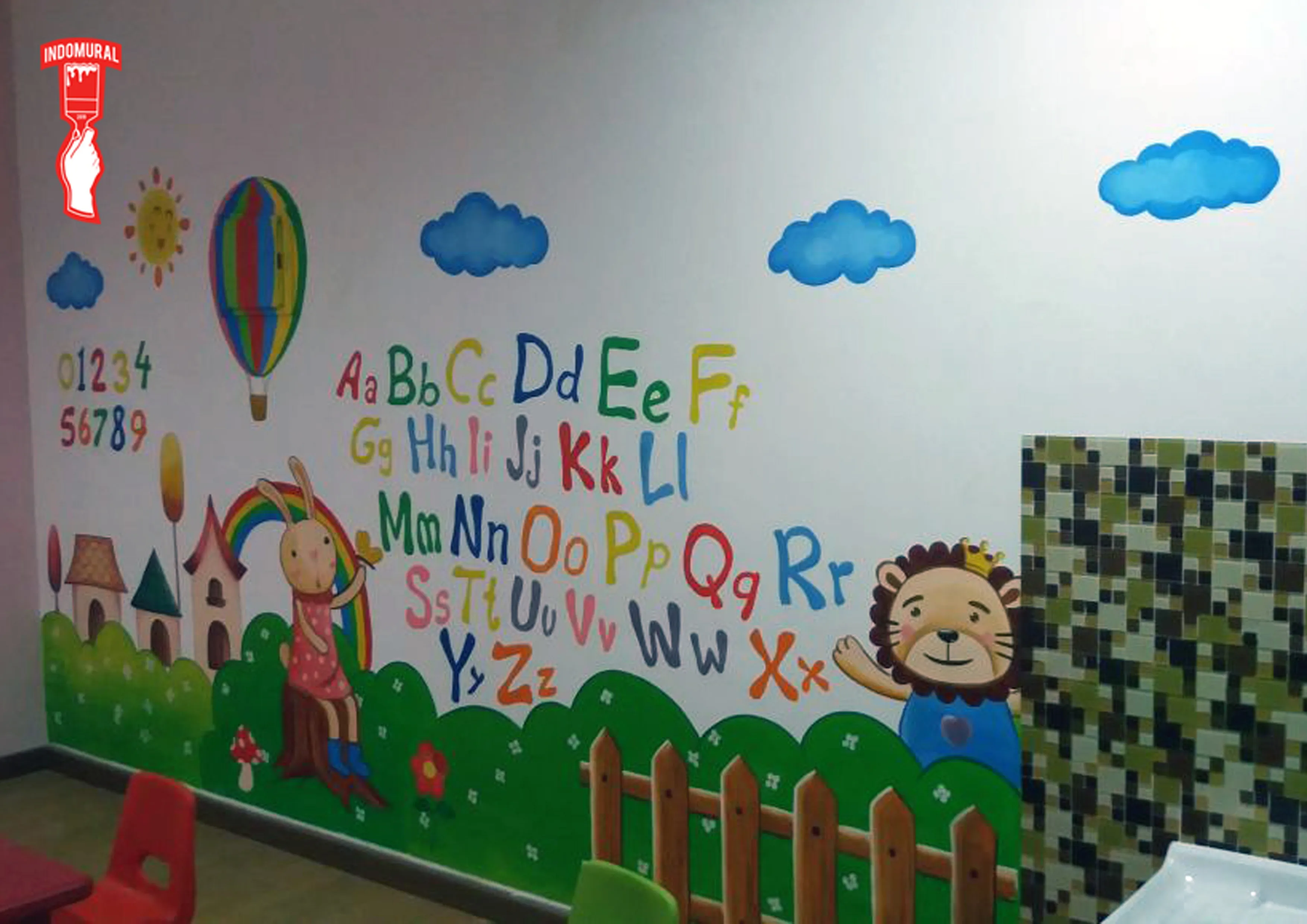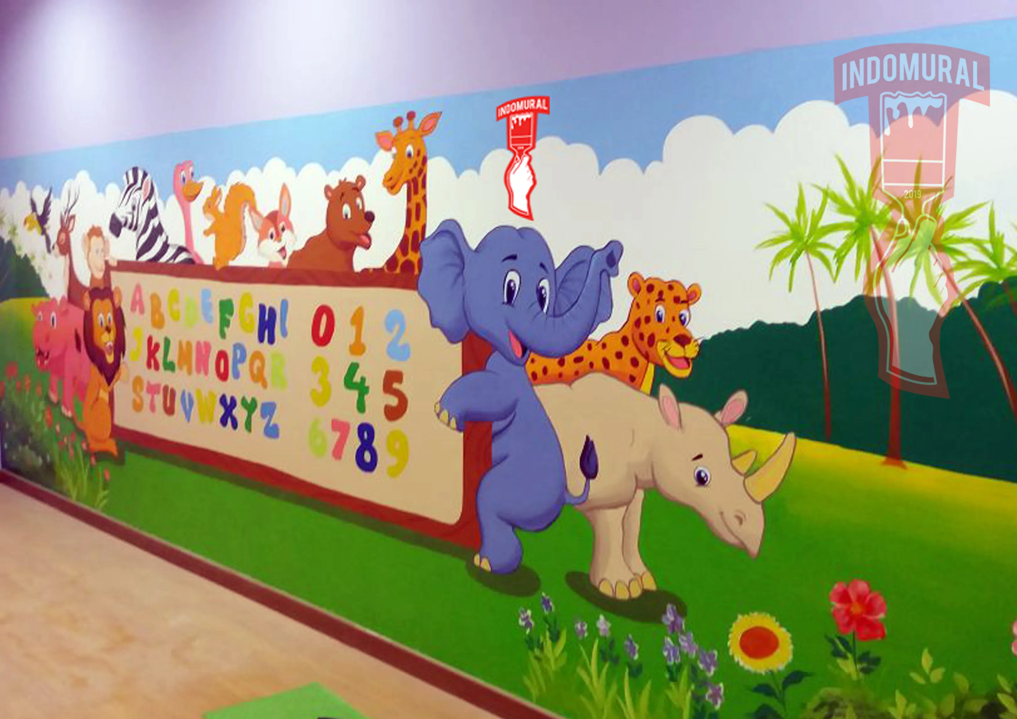 Gambar berikutnya ini terdapat lukisan dinding taman kanak-kanak dengan menghadirkan beragam hewan yg sedang mengelilingi sebuah papan yg bertuliskan beragam abjad dan angka-angka yg penih dengan warna.Cocok banget lukisan satu ini dihadirkan di ruangan belajar taman kanak-kanak ,dengan hadirnya lukisan dinding yg menarik seperti ini maka para anak murid bakal sangat tertarik untuk dapat mengingat huruf dan angka-angka yg mereka pelajari dengan melihat lukisan dinding satu ini.Mereka akan sangat