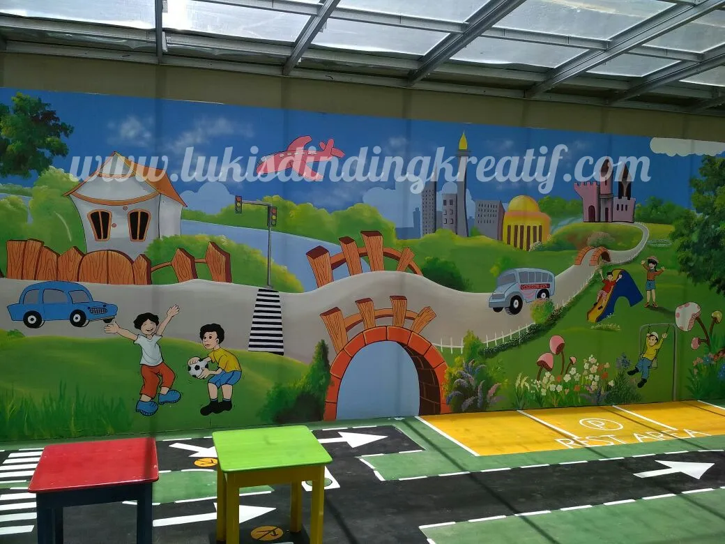 Gambar berikutnya ini terdapat lukisan dinding taman kanak-kanak dengan motif yakni suasana di lingkungan taman kanak-kanak ,hal tersebut nampak jelas pada lukisan dinding dibawah ini,terdapat anak-anak yg sedang bermain ria di taman bermain ada beberapa yg hendak pulang dan lain sebagainya ,pewarnaan yg cerah serta hasil gambar objek yg detail pada lukisan ini menjadikannya terlihat sangat bagus dan nyata.