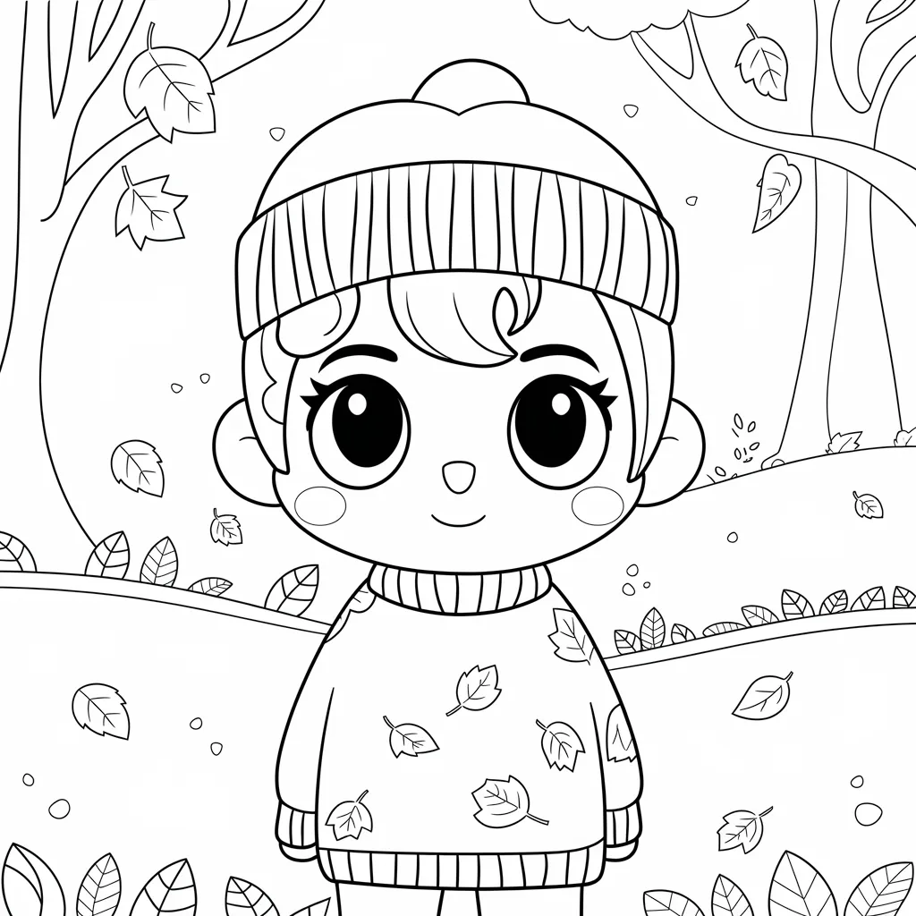 Mengenakan jaket dan syal, dengan daun-daun berguguran di sekitar.