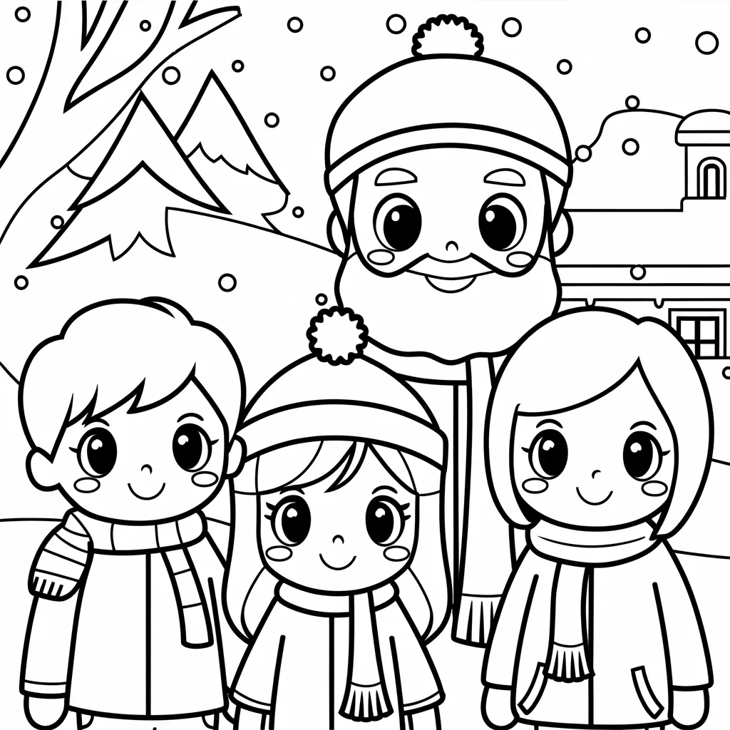 Mengenakan mantel hangat, syal, dan topi, karakter siap menghadapi musim dingin.