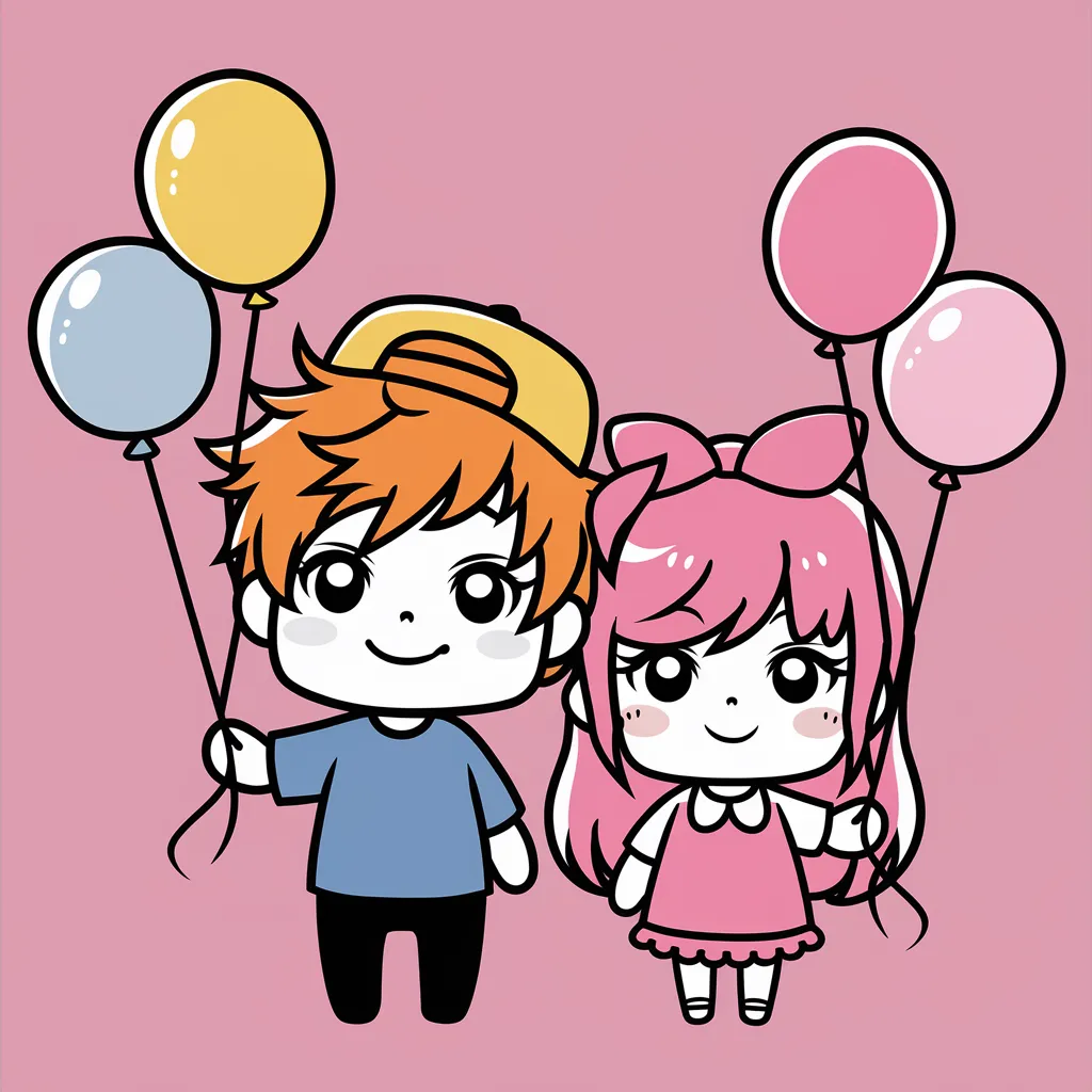 Membawa balon berwarna-warni, memberikan kesan ceria dan gembira.