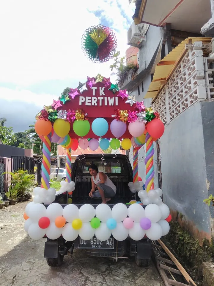 Indah dan menawan, tak berlebihan mimin menyampaikan seperti itu terhadap pada mobil hias karnaval taman kanak-kanak pada gambar diatas. Hiasan balon beram warna serta origami beragam bentuk semakin mempercantik tampilan mobil hiar karnaval TK diatas.