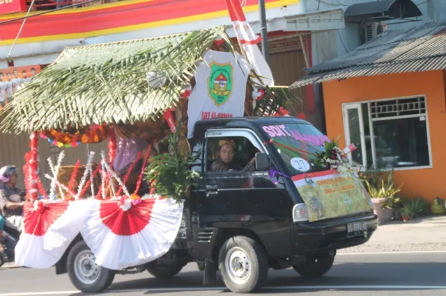 Terkesan unik dan tradisional, begitulah sekiranya yg tampak dari konsep mobil hias karnaval pada gambar diatas. Seperti yg terlihat mobil hias karnaval diatas hadir dengan hiasan daun-daun kelapa yg dijadikan sebagai atap, hiasan bunga, bendera merah putih serta lainnya.