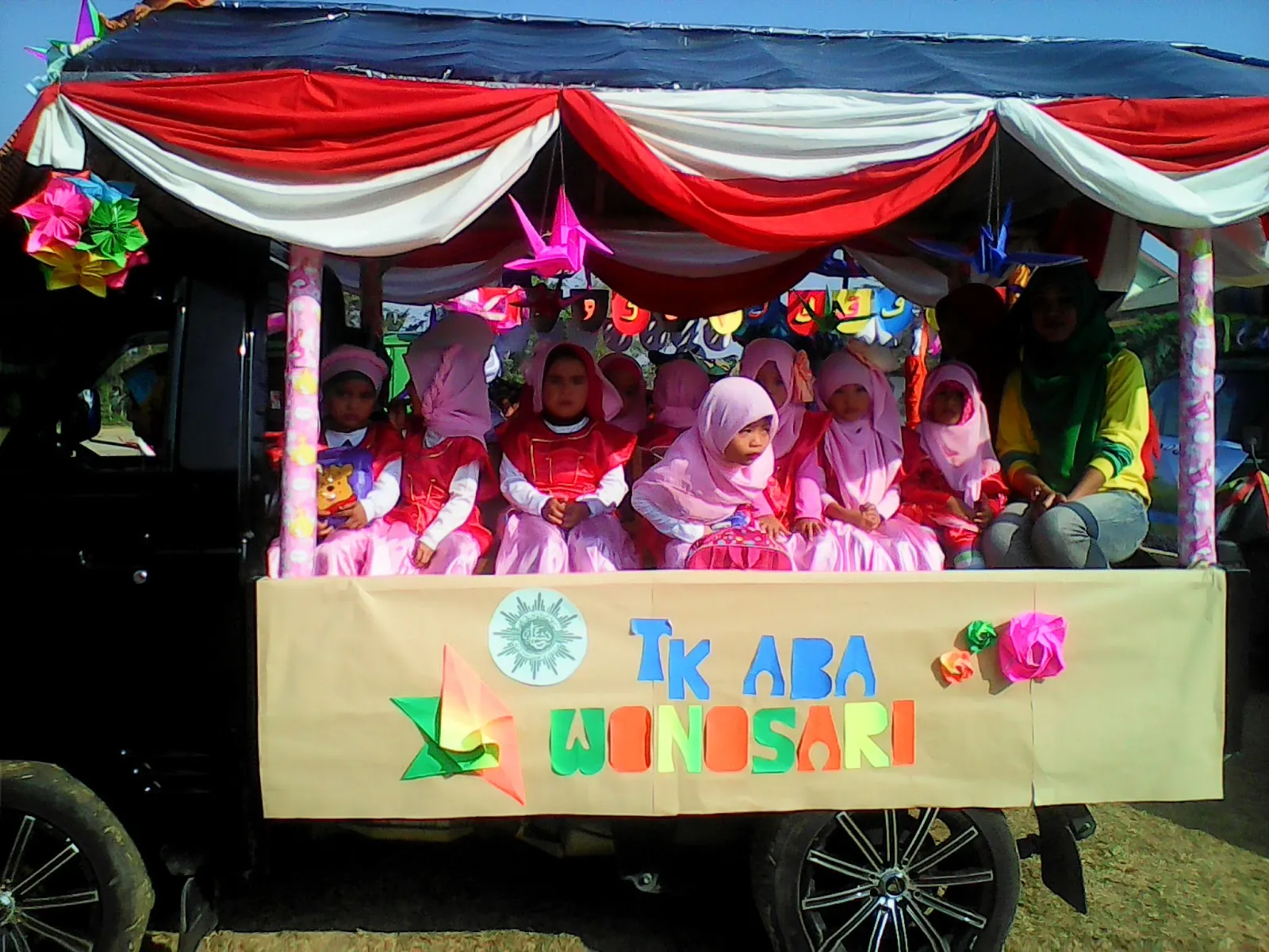 Simpel namun menawan, seperi itulah tampak mobil hias karnaval taman kanak-kanak yg terdapat pada gambar diatas. Adapun hiasan dan dekorasi yg terlihat pada mobil hias karnaval diatas mulai dari, origami beragam warna, bendera merah putih disekeliling mobil hias tersebut.
