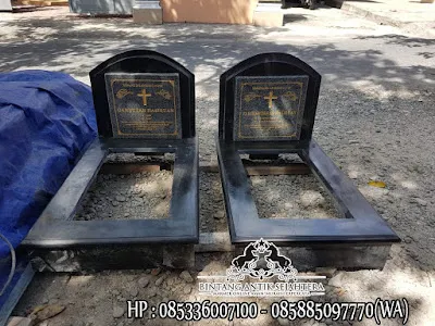 Pada gambar terakhir ini kalian akan dapat melihat tampilan model kuburan kristen bewarna hitam berbentuk yg simpel yakni persegi dengan material pembuatan yakni granit.