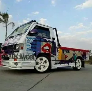 Konsep modifasiki Mitsubishi L300 diatas bila diikutkan dalam kontes ya sudah jelas juara 1. Terlihat Mitsubishi L300 diatas hadir dengan tampilan body warna kuning dengan decal motif gambar yg keren banget sob. Terlebih dengan dipasangkannnya velg type casting semakin memperkeren Mitsubishi L300 pada gambar diatas.