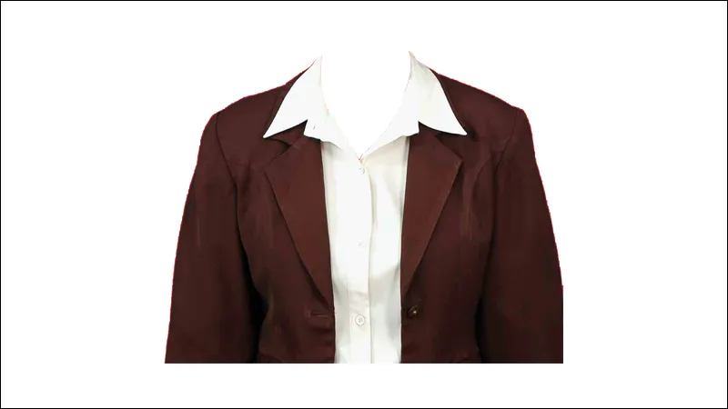 Tampak pada gambar diatas ialah pas photo jas wanita bewarna cokelat yg tidak terkancing dan dipasangkan pada kemeja bewarna putih sehinga terkesan resmi dan terlihat cantik.