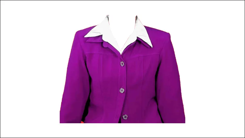 Tampak pada gambar diatas ialah pas photo jas wanita bewarna ungu yg dipasangkan pada kemeja bewarna putih, dengana