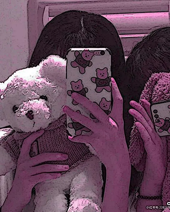 Bertikut pada gambar diatas gambar seorang gadis yg sedang memegang sebuah boneka beruang bewarna putih dan hp ditangannya.