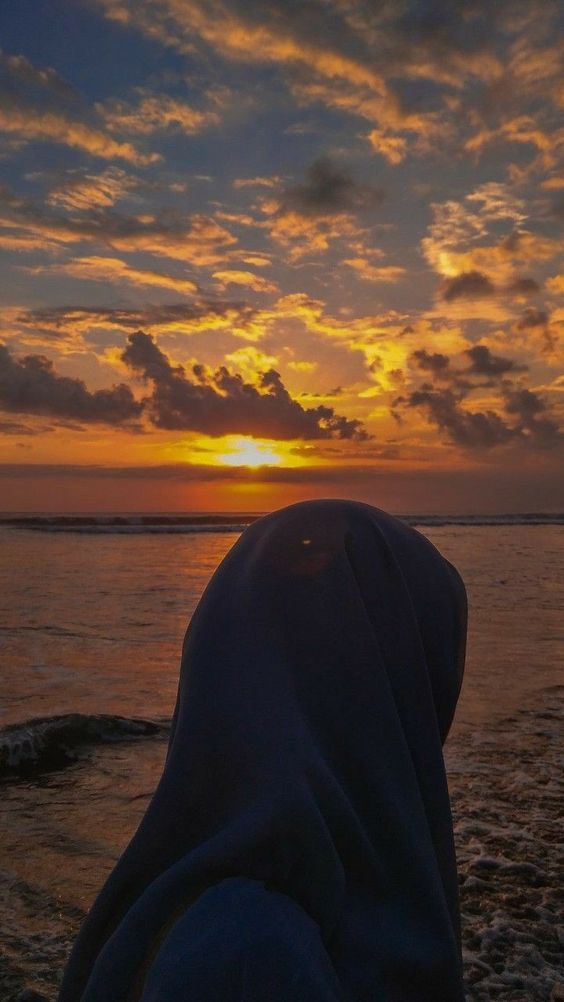 Berikutnya pada gambar diatas ialah foto keren dan aesthetic dengan tampilan seorang wanita berhijab yg sedang duduk ditepi mantai menikmati indahnya senjah dikala petang menuju malam.
