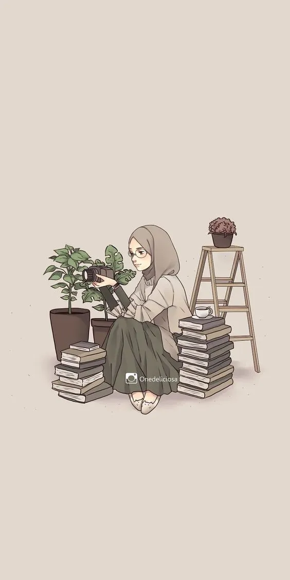 Adapun berikutnya ini ialah foto kartun seorang wanita berhijab yg sedang duduk sambil memegang sebuah kamera ditangannya dengan dikelilingi tumpukan buku yg sangat banyak, bunga, serta tanaman. Tampilan foto diatas terlihat bisa bangetlah sob kalian pakai untuk dijadikan Pp Wa atau lainnnya.