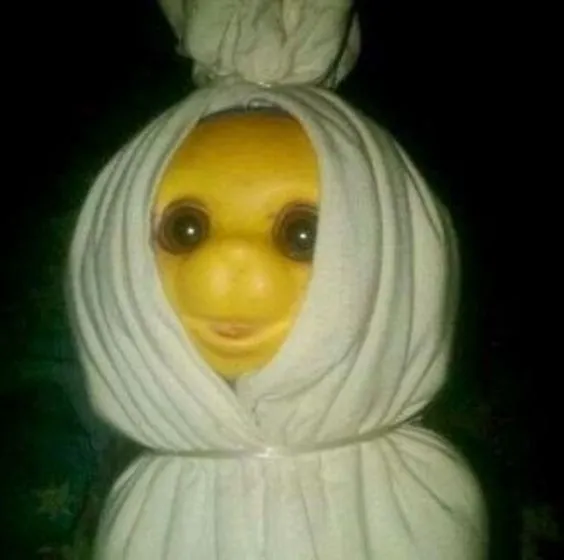 Lucu dan namun sedikit menyeramkan juga tampilan gambar boneka yg dibungkus dengan kain sehingga nampak seperti poci ( pocong ) pada gambar diatas sob.