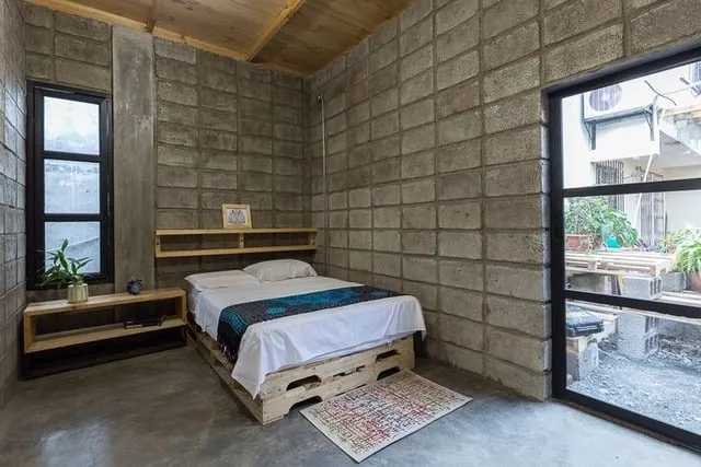 Rumah hebel tanpa plester terlihat sangat menarik jika dipadukan dengan material kayu. Bisa dikatakan kalau Hebel ekspos pada seluruh dinding menjadikan hunian tersebut tampak lebih menonjol dan maskulin. Sementara itu, material kayu membuat hunian menjadi terasa lebih manis dan hangat.