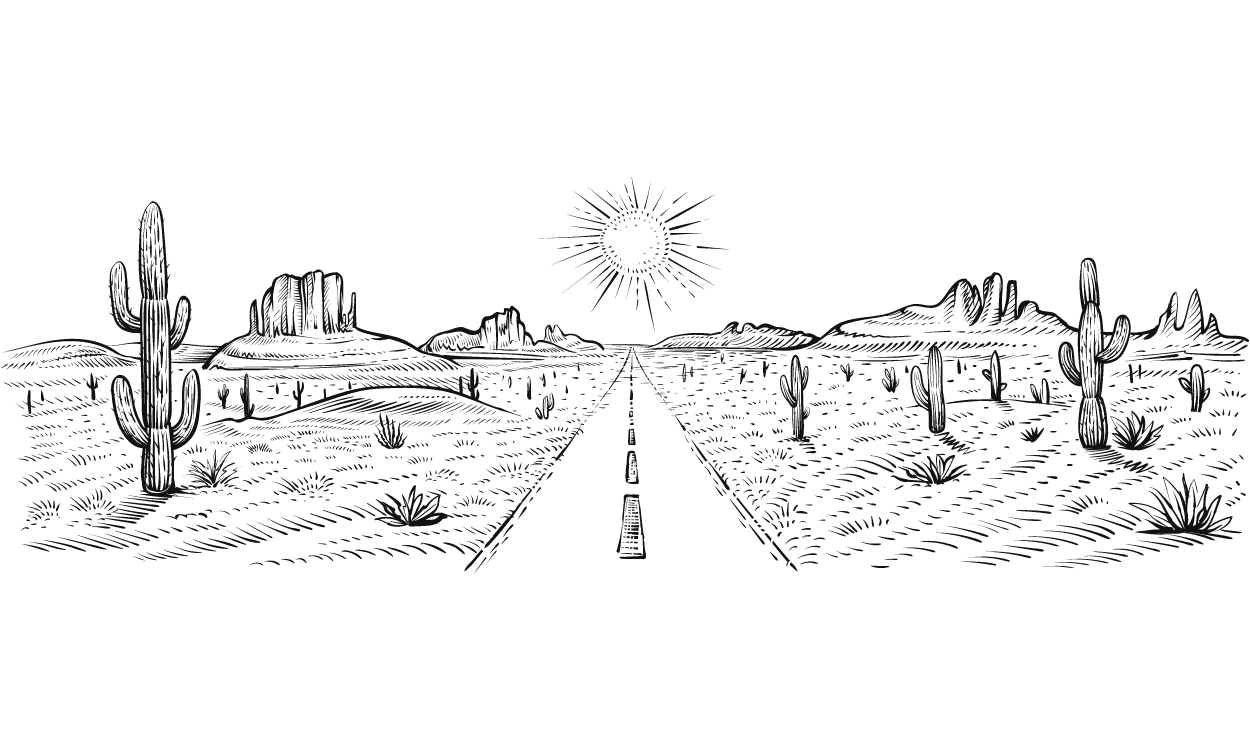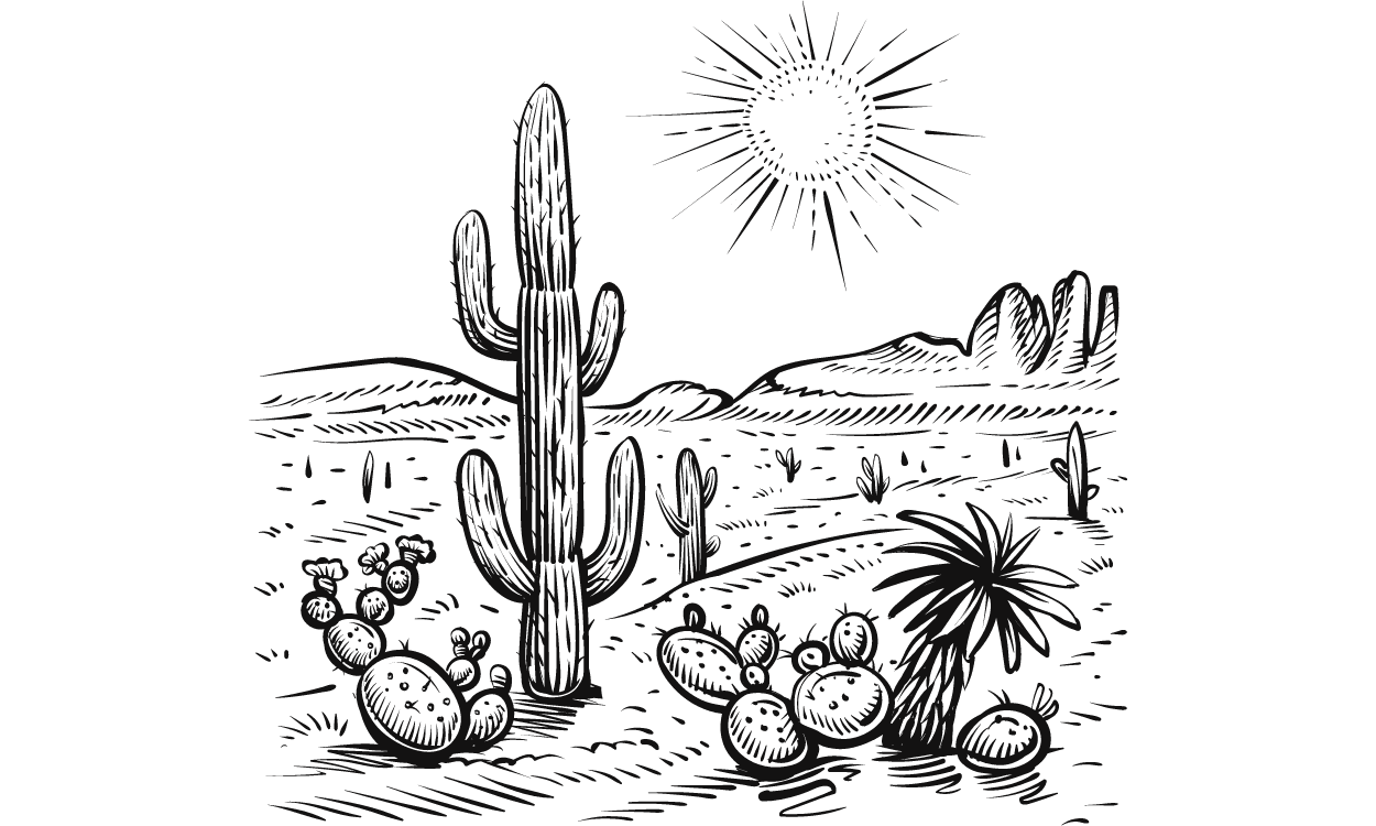 Adapun pada gambar diatas tampilan gambar lukisan sketsa pemandangan hamparan gurun lengkap dengan banyak pepohonan kaktus dan jalan lurus pada bagian tengahnya. Meskipun gurun terkenal dengan kekeringan dan kekosongan, tampilan lukisan dengan pepohonan kaktus yang banyak dapat memberikan kesan indah dan menenangkan.