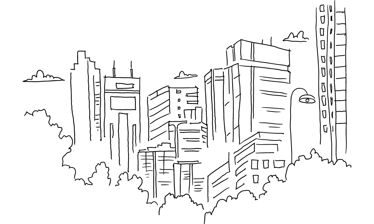 Tampak pada gambar diatas tampilan gambar sketsa pemandangan bangunan perkotaan yang menjulang tingi. Gambar sketsa tersebut menunjukkan kekuatan dan kemegahan bangunan-bangunan perkotaan yang tinggi. Hal ini dapat memberikan kesan keberhasilan dan kemajuan pada wilayah perkotaan yang digambarkan. Beberapa orang mungkin merasa terintimidasi atau takut dengan tampilan bangunan-bangunan perkotaan yang sangat tinggi. Hal ini dapat mengingatkan mereka akan potensi risiko yang terkait dengan perkembangan pesat perkotaan seperti polusi, kebisingan, dan kerumunan.