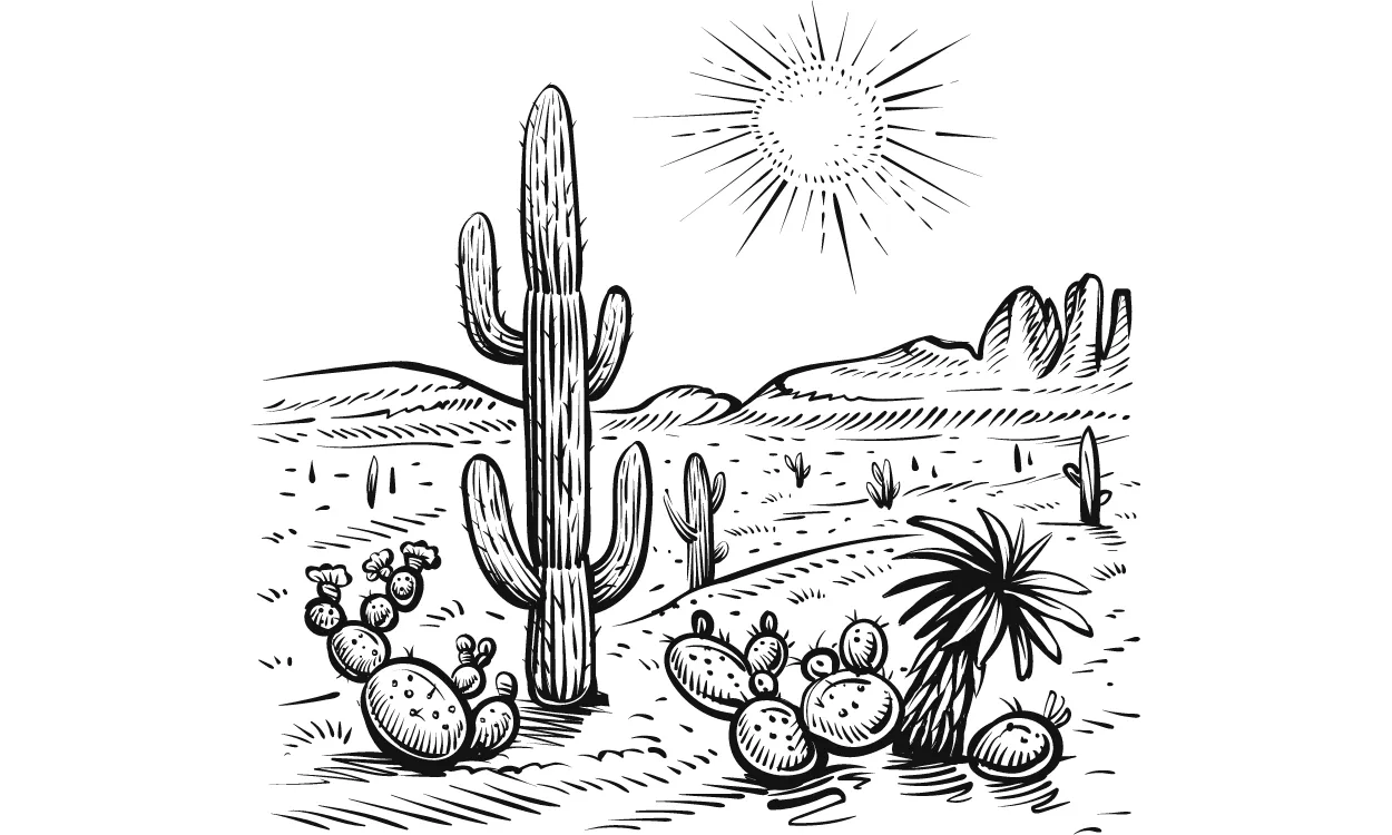 Adapun pada gambar diatas tampilan gambar lukisan sketsa pemandangan hamparan gurun lengkap dengan banyak pepohonan kaktus dan jalan lurus pada bagian tengahnya. Meskipun gurun terkenal dengan kekeringan dan kekosongan, tampilan lukisan dengan pepohonan kaktus yang banyak dapat memberikan kesan indah dan menenangkan.