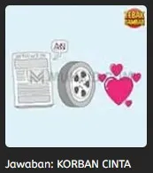Beberapa objek gambar yg terdapat pada tebak gambar level 49 diatas ialah seperti, koran, ban, dan bentuk love atau cinta. Dan klu yg diberikan pada tebak gambar diatas ialah, huruf (AN), yg disilang perlu untuk dihilangkan. Dari kesemua objek gambar dan klu yg ada pastinya kalian dapat dengan mudah menebak tebak gambar diatas. Dan jawaban tebak gambar diatas ialah “KORBAN CINTA”.
