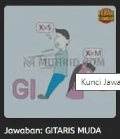 Adapun ragam objek gambar pada tebak gambar diatas ialah seperti, huruf (GI), seorang lelaki yg sedang menarik sesuatu, dan kuda. Dan adapun klu atau kisi-kisi yg dihadirkan pada tebak gambar diatas ialah seperti huruf K yg disilang dan perlu diganti menjadi huruf S, huruf K yg disilang dan diganti dengan huruf M. Dari kesemua objek gambar dan kisi-kisi yg terdapat pada tebak gambar diatas, maka dapat diketahuilah bahwa jawaban tebak gambar diatas ialah” GITARIS MUDA”.