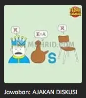 Pada gambar pertama ini mimin hadirkan tebak gambar level 49 dengan tampilan ragam objek gambar didalamnya seperti, seorang raja, kendi dan kursi. Dari kesemua objek gambar dan klu yg dihadirkan pada tebak gambar diatas, dapat dketahui jawaban dari tebak gambar level diatas ialah “AJAKAN DISKUSI”.