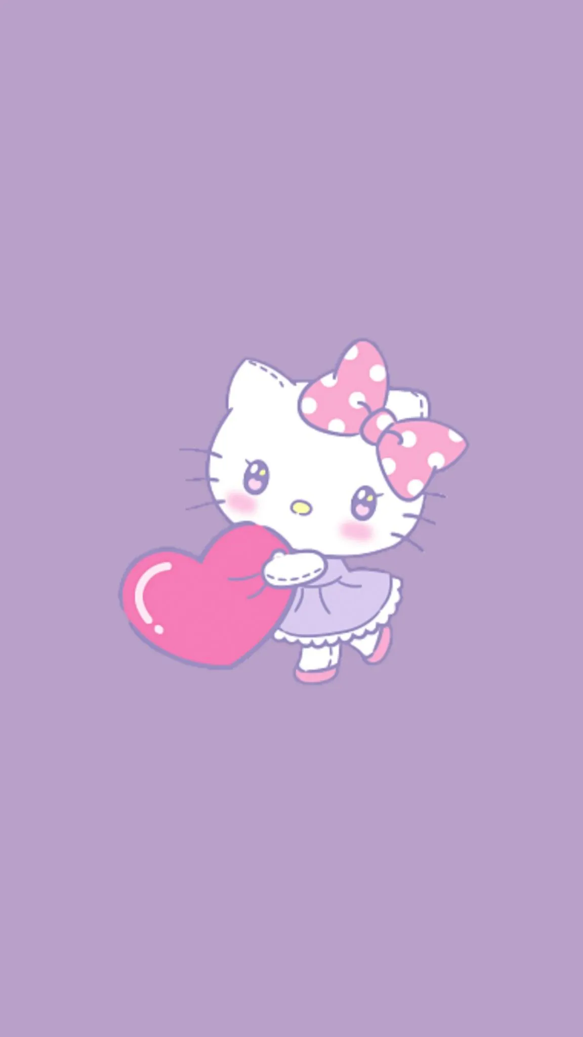 Tampilan gambar Hello Kitty dengan mengenakan dres warna ungu dan pita warna pink motif bulat-bulat kecil warna putih, memegang boneka love warna pink, dan latar belakang warna ungu akan memberikan kesan lucu, girly, dan manis. Warna ungu yang digunakan memberikan kesan misterius dan elegan, sementara warna pink menambahkan sentuhan feminin dan manis pada tampilan. Motif bulat-bulat kecil pada pita dan boneka love menambahkan kesan lucu dan menggemaskan pada keseluruhan tampilan. Keseluruhan tampilan dapat menjadi walpaper yang cocok untuk pengguna yang menyukai karakter Hello Kitty dan suka dengan nuansa warna yang manis dan feminin.